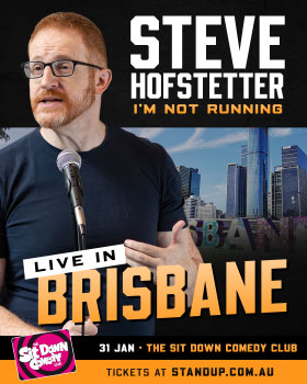 *All ‘Steve Hofstetter: I’m Not Running 2027 Tour’ transactions incur a booking fee of $3 per ticket. Please familiarise yourself with SDCC’s Terms & Conditions of Sale prior to purchasing your tickets by visiting https://www.standup.com.au/terms-and-conditions-sale. No Free Tickets. Groupon/Scoopon/Cudo/Deals vouchers are not valid for this performance. Online ticketing will close 4 hours prior to the show on the day of the event. After this time, tickets will be available for purchase on the door unless sold out prior. The Sit Down Comedy Club is licensed – strictly no admittance to people under 18 years of age. Performer line up is correct at time of publication, however is subject to change without prior notification and at the discretion of management. Some performance concepts and language may offend. Filming may be occurring in the venue for this performance. Seating allocated by SDCC depending on booking group sizes and chronological order of bookings. PLEASE NOTE: You may be seated at a table with other booking groups.